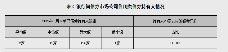 2026年2月末,银行间债券市场的法人机构成员共3890家,全部为金融机构。从持债规模看,公司信用类债券前50名投资者持债占比53.7%,主要集中在国有大型商业银行(自营)、公募基金(资管)、保险类金融机构(资管)等;前200名投资者持债占比84.4%。